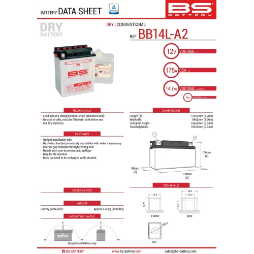 BS АКУМУЛЯТОР BB14L-A2 (YB14L-A2) 12V 14AH 135X91X167 OBSLUGOWY - ELEKTROLIT OSOBNO (175A) (4) UE2019/1148